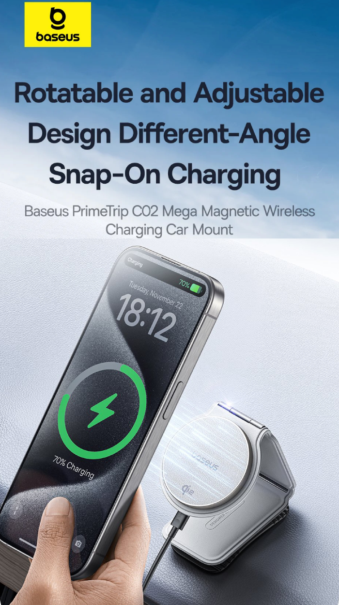 شارژر و پایه نگهدارنده Baseus PrimeTrip C02 Mega با ترکیب قدرت جذب بالا، شارژ سریع ۱۵ واتی، طراحی لوکس و متریال باکیفیت، گزینهای ایدهآل برای رانندگانی است که به ایمنی، کارایی و زیبایی اهمیت میدهند.