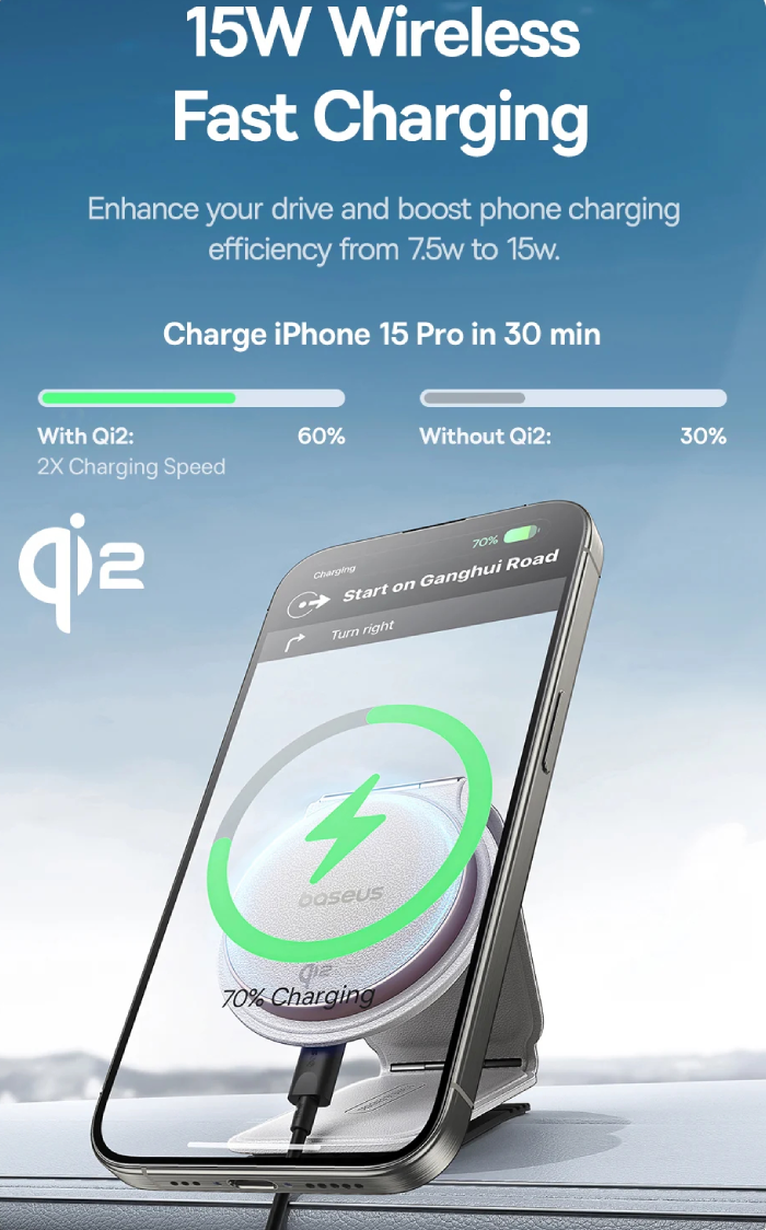 شارژر وایرلس خودرو Baseus C02 Mega از نسل تازه فناوری Qi2 پشتیبانی میکند که سرعت شارژ را تا دو برابر نسبت به مدلهای قبلی افزایش داده است. بهعنوان مثال، میتواند گوشی آیفون 15 پرو را تنها در 30 دقیقه تا 60 درصد شارژ کند.