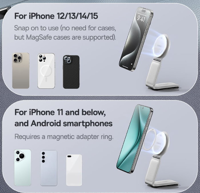 برای گوشیهای اندروید و آیفونهای قدیمیتر، در بستهبندی حلقه مغناطیسی مخصوص قرار داده شده تا بتوانید از خاصیت مگسیف روی هر گوشی استفاده کنید.
