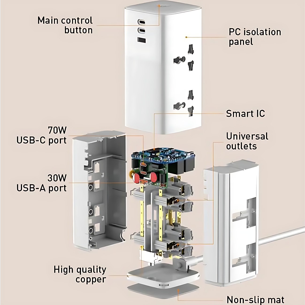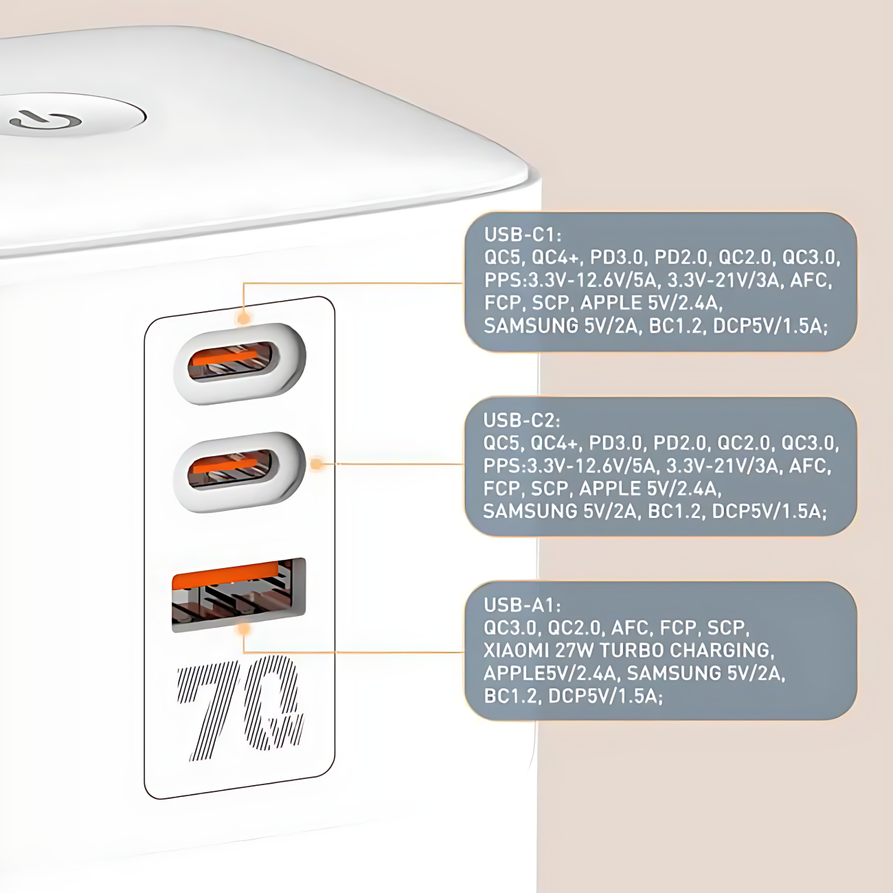 سایر ویژگی ها | - شارژ سریع PD 70W - مجهز به فناوری GaN - پشتیبانی از انواع پروتکلهای شارژ سریع - قابلیت شارژ سریع لپ تاپ - شارژ ایمن با حفاظت 9گانه - طراحی عمودی جهت صرفهجویی در فضای کار - محافظت در برابر برقگرفتگی و نوسانات |