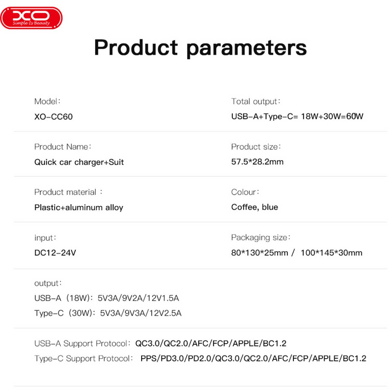 XO car charger CC60 60W 1x USB 1x USB-C blue + USB-C - USB-C cable