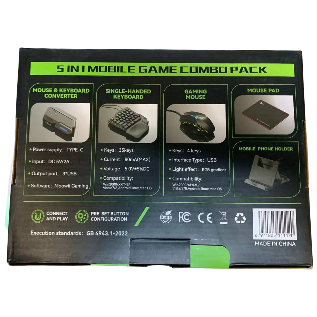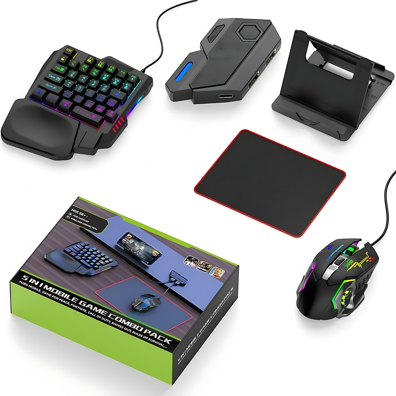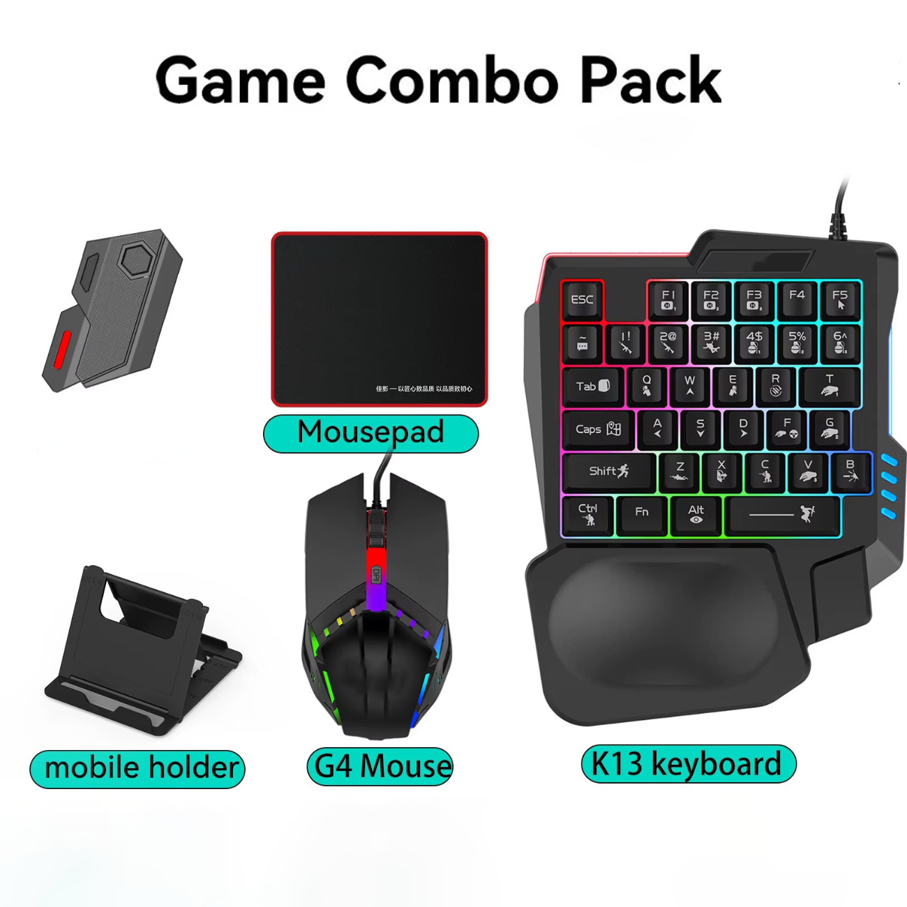 شامل اقلام | کیبورد گیمینگ تکدستی، موس گیمینگ، مبدل Type-C سهپورت، موسپد، هولدر موبایل |