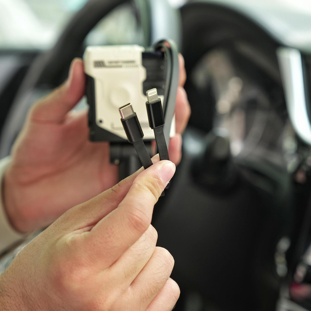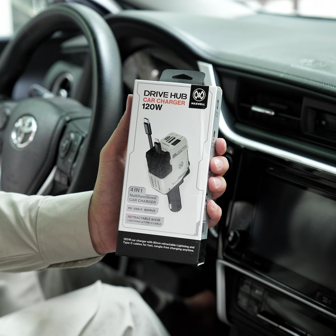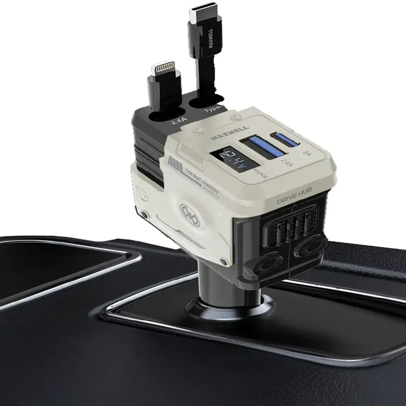 شارژر فندکی فست شارژ ماشین تایپسی و یواسبی 120 وات مکسول Maxwell DRIVE HUB با کابل جمع شونده لایتنینگ و تایپسی