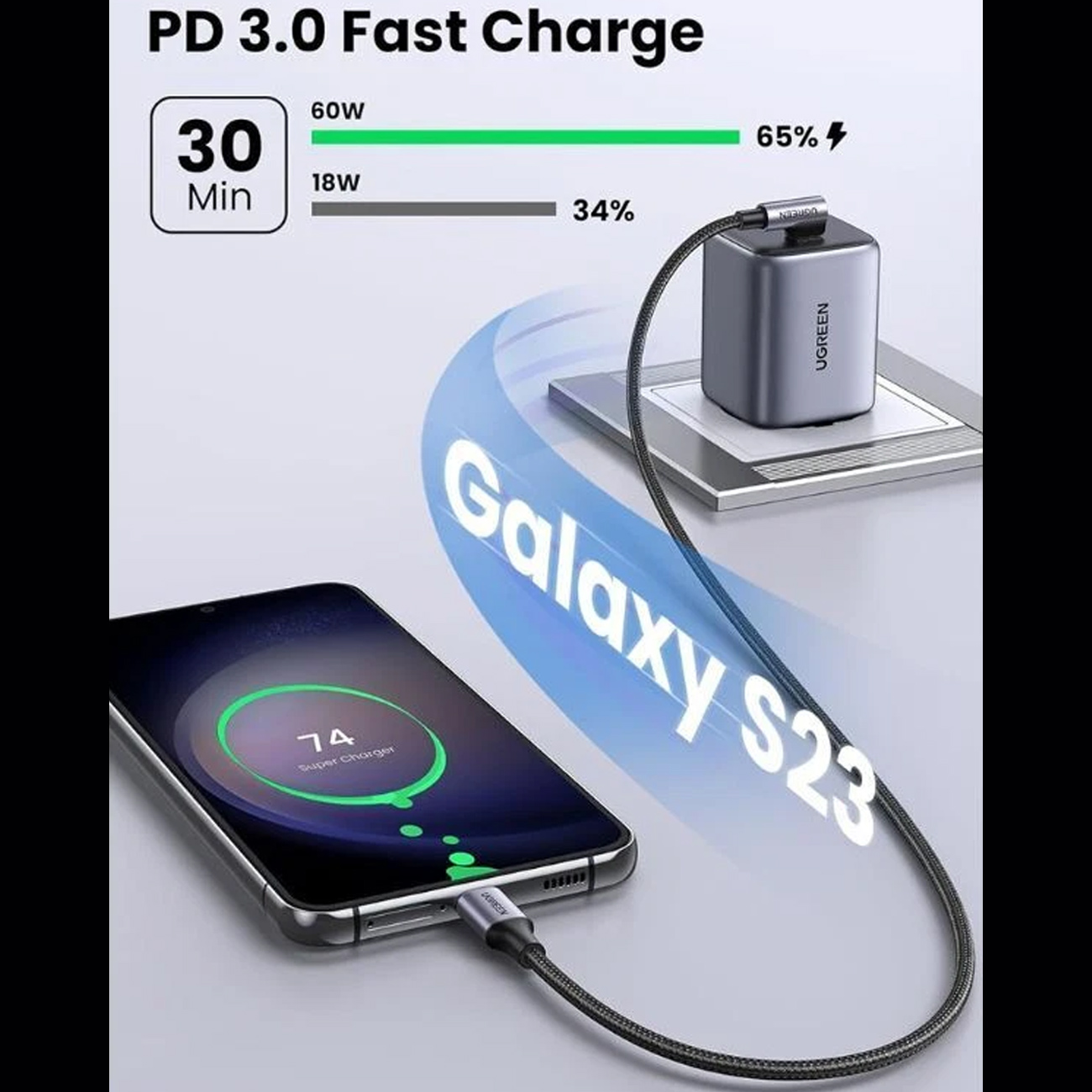 کابل تایپسی به تایپسی 60 وات 3 آمپر یک متری یوگرین ugreen US255 50123 شارژ سریع و انتقال دیتا