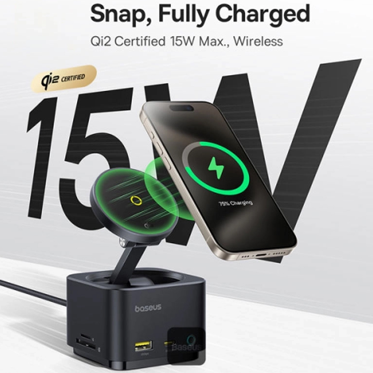 | سایر ویژگیها | طراحی مکعبی جمعوجور مناسب سفر و میزهای مینیمال پایه مغناطیسی قابل تنظیم برای آیفونهای MagSafe قابلیت شارژ همزمان لپتاپ و گوشی بدون افت سرعت انتقال فایلهای حجیم در چند ثانیه سازگاری گسترده با انواع گوشی، لپتاپ و تبلت طراحی تاشو برای حمل آسان One-Click Screen Off |
