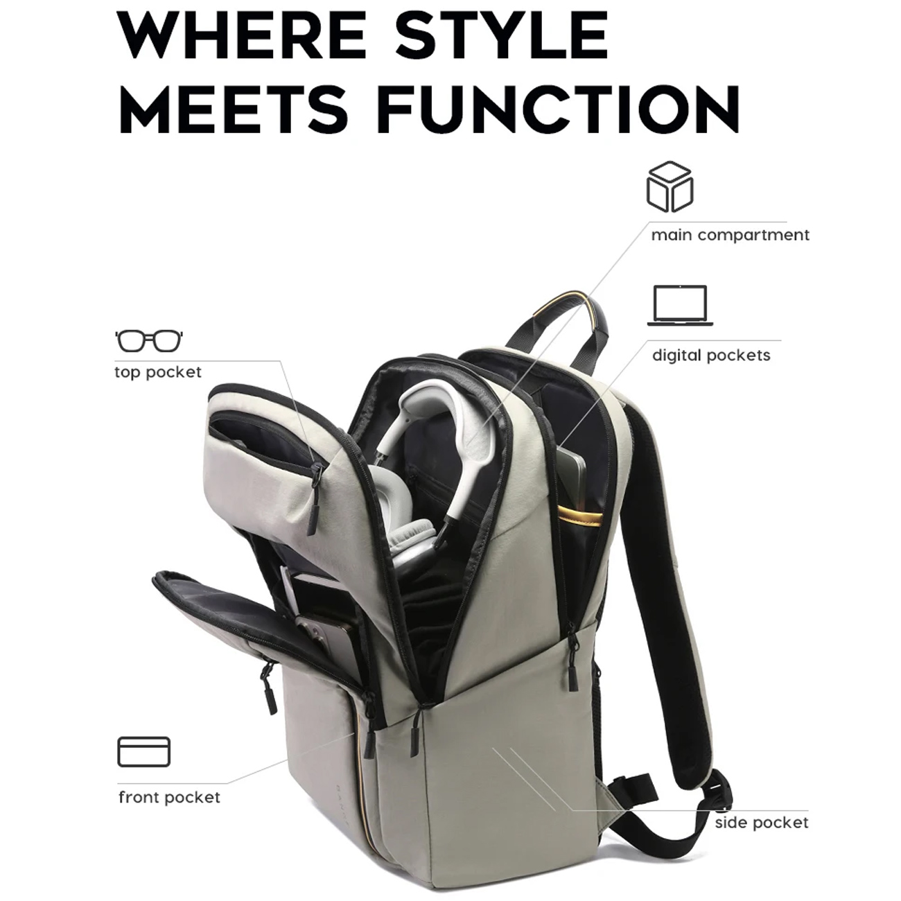 | تعداد جیب | ۸ عدد (جیب اصلی، جیب لپتاپ جداگانه، جیب لپتاپ و آیپد، جیبهای دیجیتال، جیب بالایی، جیب جلویی، دو جیب کناری). |