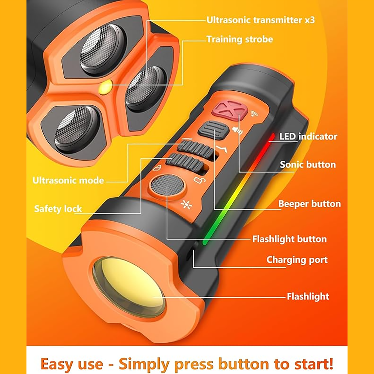 | سه قابلیت مفید | صدای اولتراسونیک برای متوقف کردن صدا و رفتارهای نادرست، حالت بوق هشدار برای آموزش، و چراغقوهی پرنور برای پیادهروی شبانه یا مواقع ضروری |
