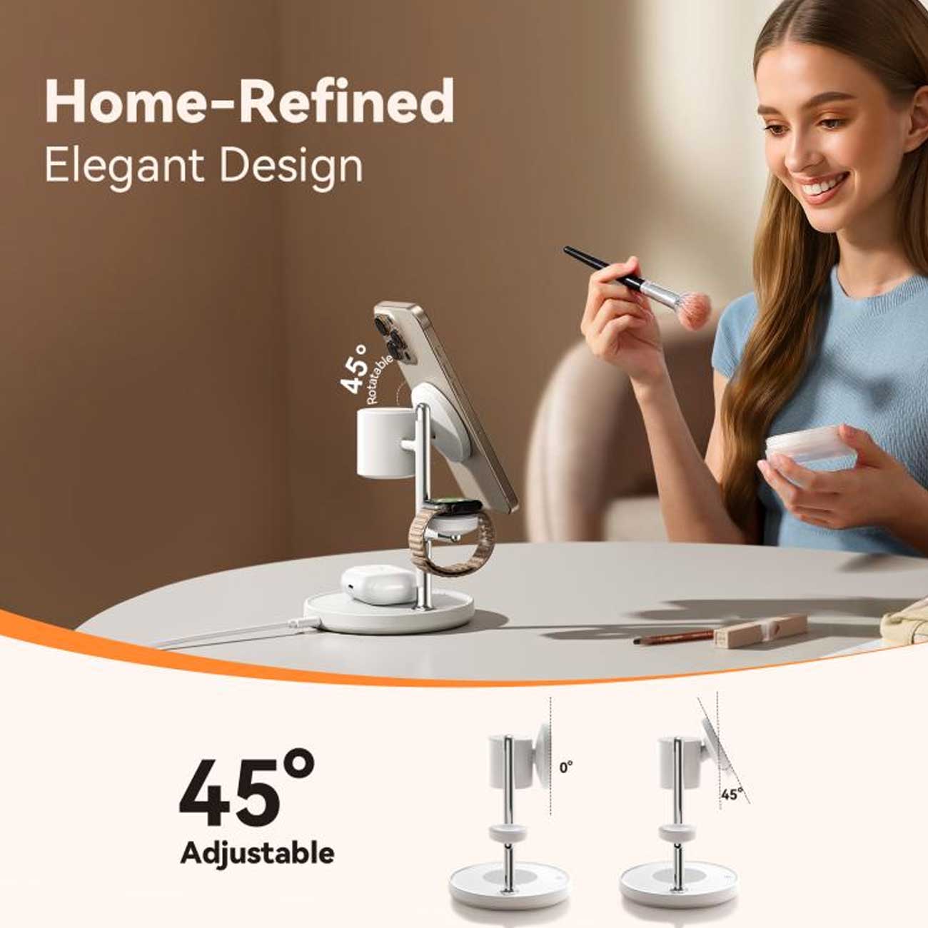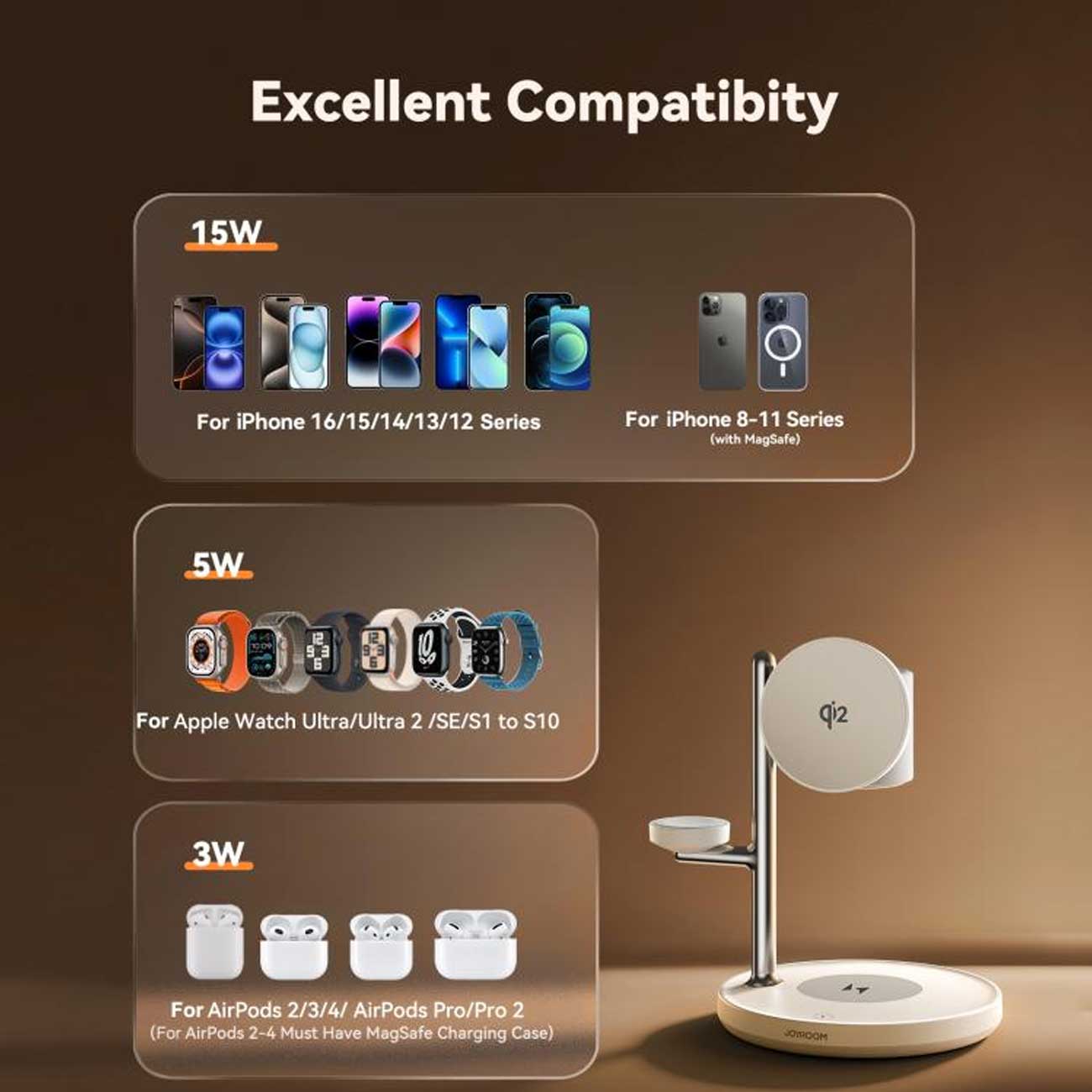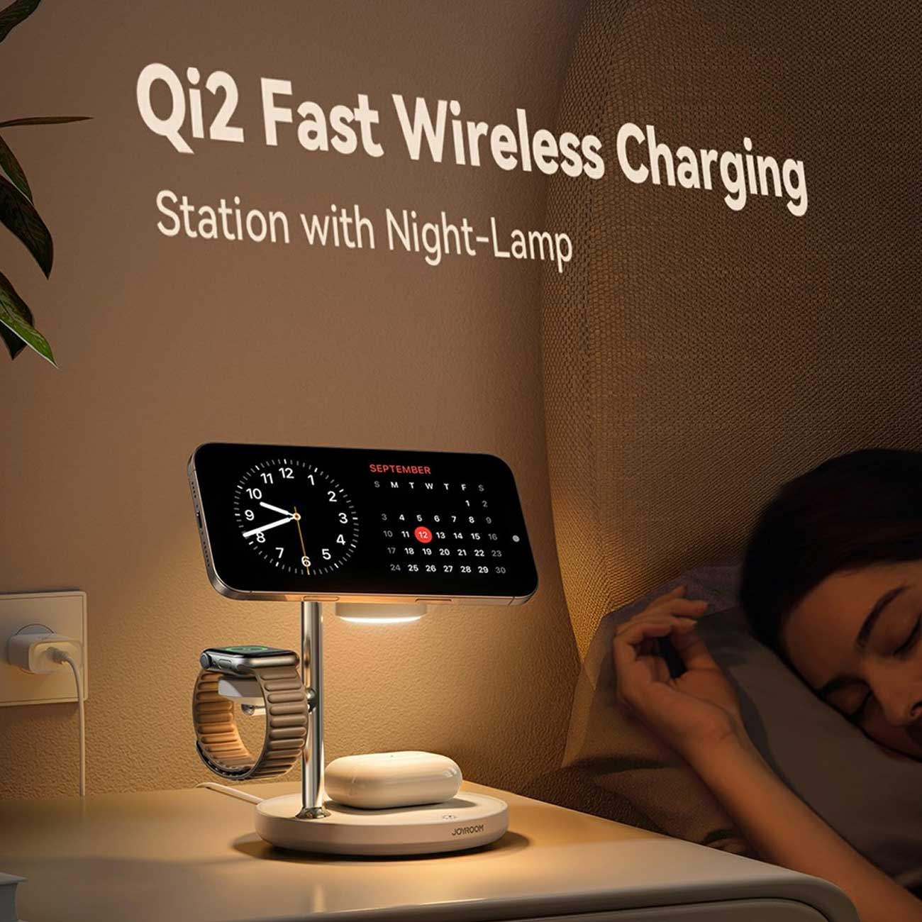 شارژر وایرلس Qi2 گوشی، اپل واچ و ایرپادز 4 کاره جویروم JOYROOM JR-W23 با چراغ خواب