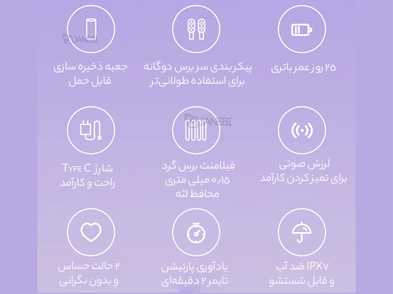 | محتویات بسته بندی | دسته مسواک، کابل شارژ، سر مسواک، دفترچه راهنما |