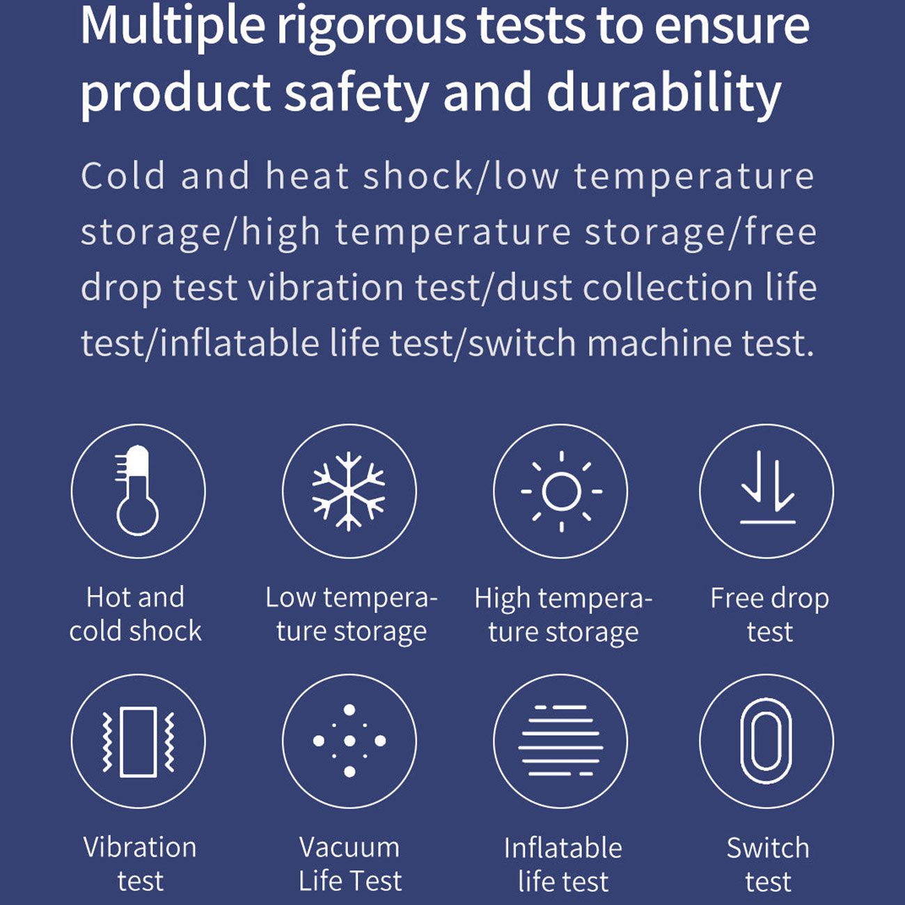 | سیستم ایمنی | تست روشن و خاموش کردن دستگاه, تست سقوط آزاد, تست عمر باد کردن, تست عمر جمعآوری غبار, تست لرزش, ذخیره سازی در دماهای بالا و پایین, شوک حرارتی |