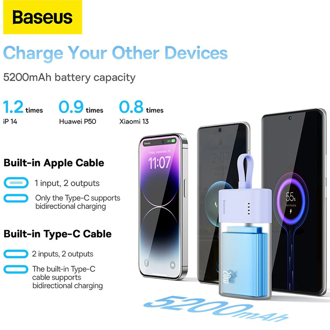 | کابل های داخلی | کابل داخلی (Lightning یا USB‑C) + پورت USB‑C دوطرفه (ورودی/خروجی) |