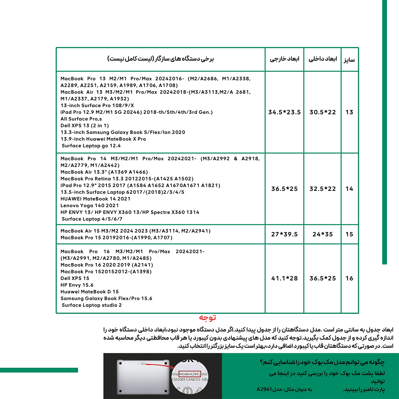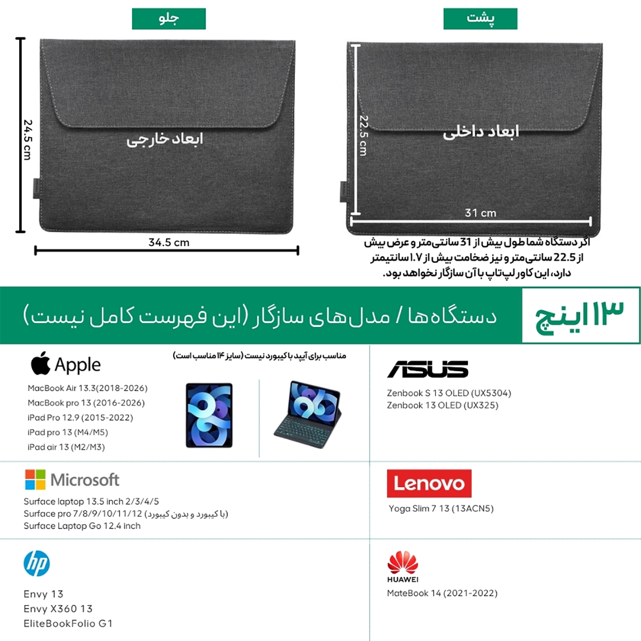 | ابعاد | 13 اینچ ( M) / ابعاد داخلی: 30×22 سانتی متر؛ ابعاد خارجی: 24.5×33 سانتی متر,14 اینچ (L) / ابعاد داخلی: 32×23 سانتی متر؛ ابعاد خارجی: 35×25.5 سانتی متر,16 اینچ(XL) / ابعاد داخلی: 36×25.5 سانتی متر؛ ابعاد خارجی: 39×28 سانتی متر |