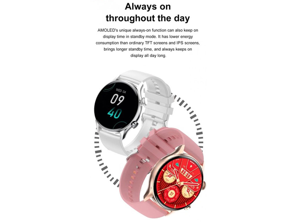 | سایر ویژگیها | دانلود انبوه شماره گیری، آپلود عکس، جستجوی تلفن همراه، کالری، بلوتوث، اطلاعات، وی چت، تنظیم ساعت زنگ دار، یادآوری آب نوشیدن، کنترل هوشمند حرکتی، حالت مزاحم نشوید، حالت یادآوری. تلفن، اس ام اس، وی چت، QQ، فیس بوک، توییتر، اینستاگرام، اسکایپ، واتس اپ، خط، کاکائو تاک، پشتیبانی از بسته زبان NFC Watch زمان شارژ 2 ساعتمدت زمان استفاده معمولیاستفاده در حالت تماساستندبای 30 روز |