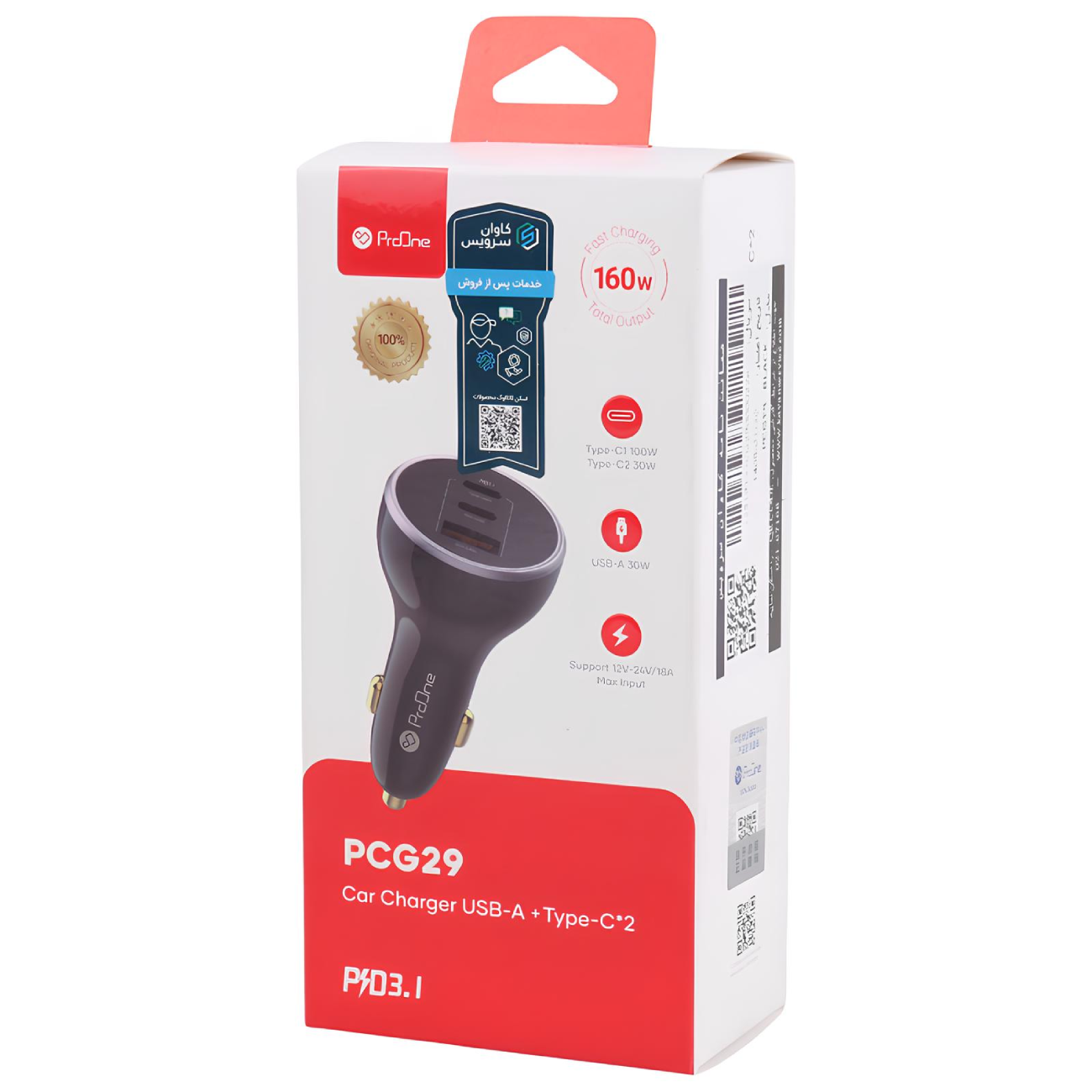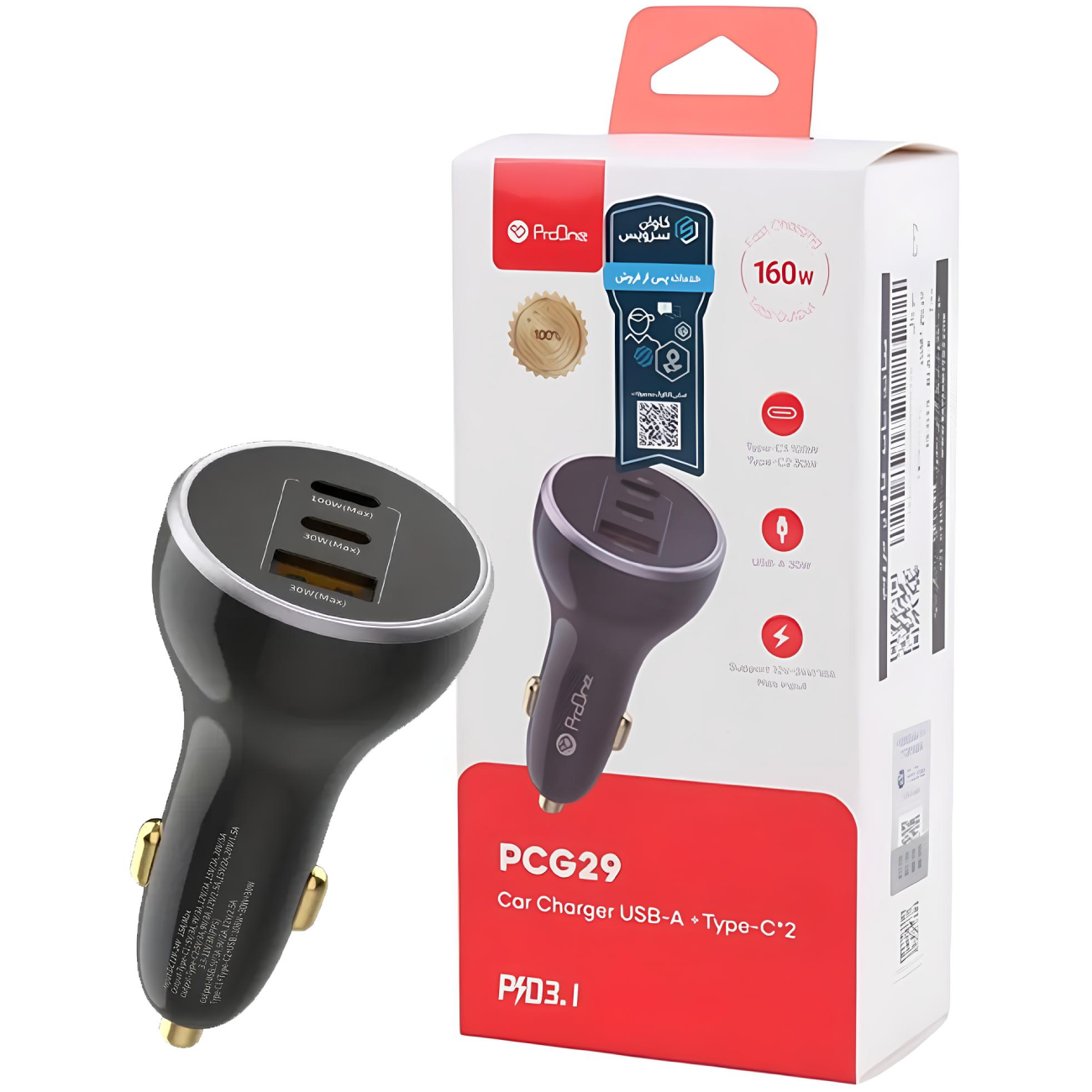 شارژر فندکی فست شارژ ماشین تایپ سی و یو اس بی 160 وات پرووان PCG29