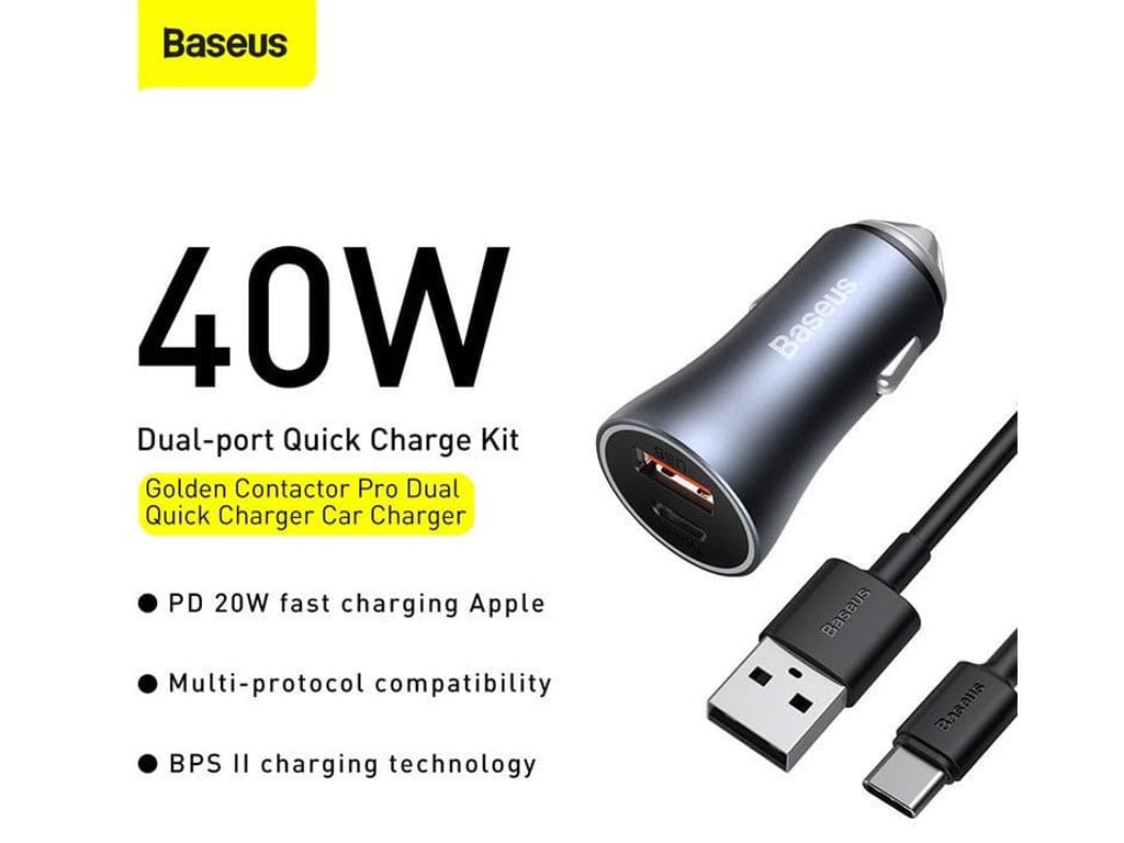 شارژر فندکی فست شارژ 40 وات با کابل تایپسی بیسوس Baseus Car Charger Golden Contactor Pro Type-C/USB TZCCJD-0G