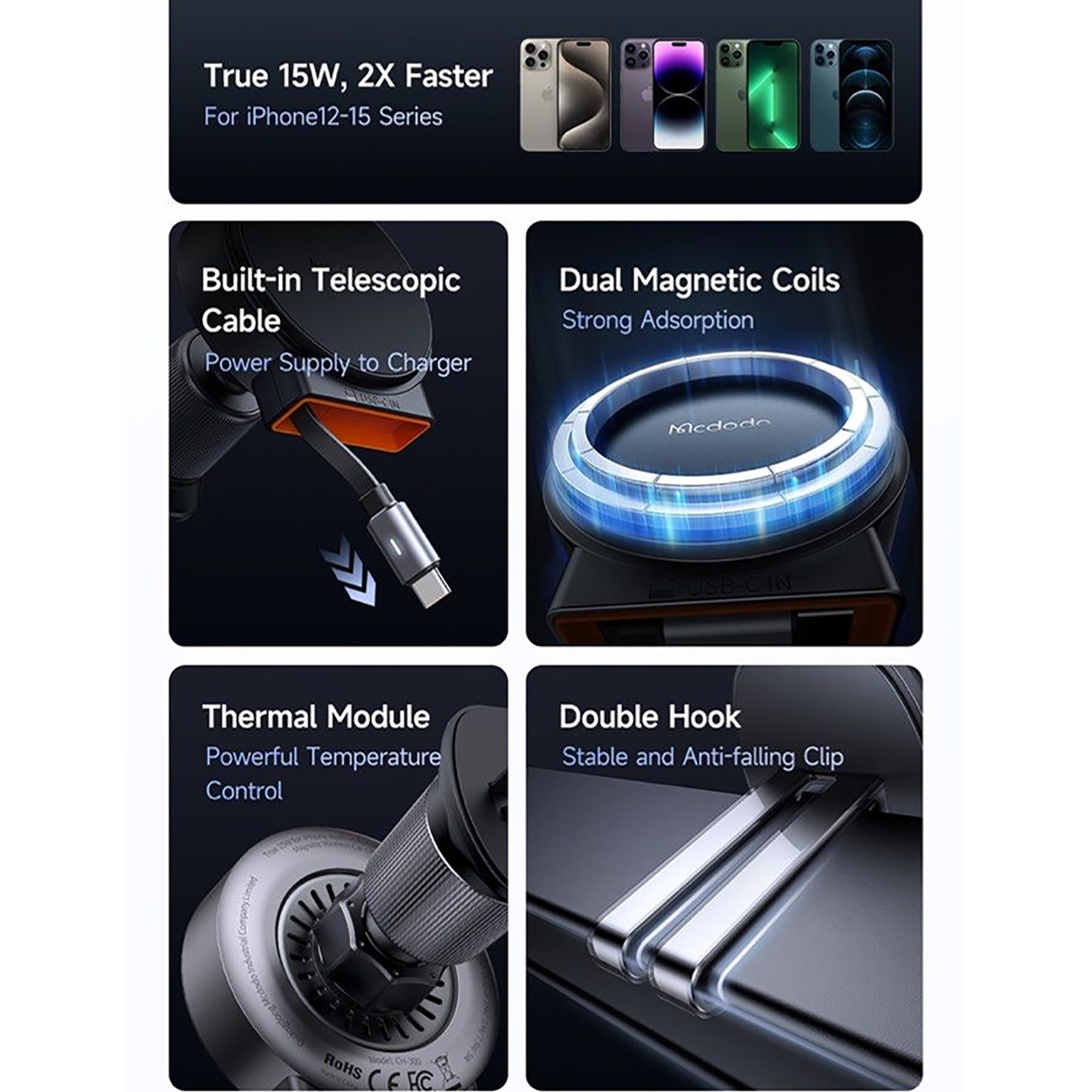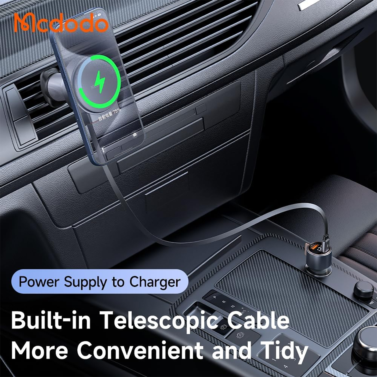 Mcdodo 15W Magnetic Wireless Car Charger with Retractable Cable