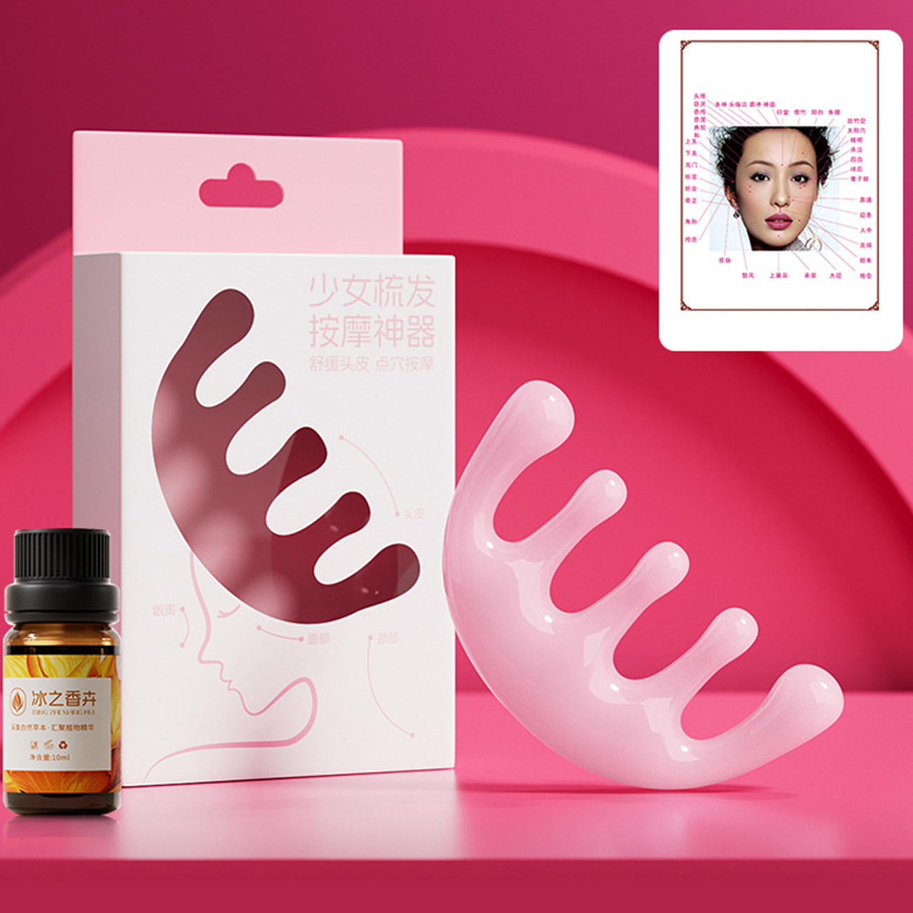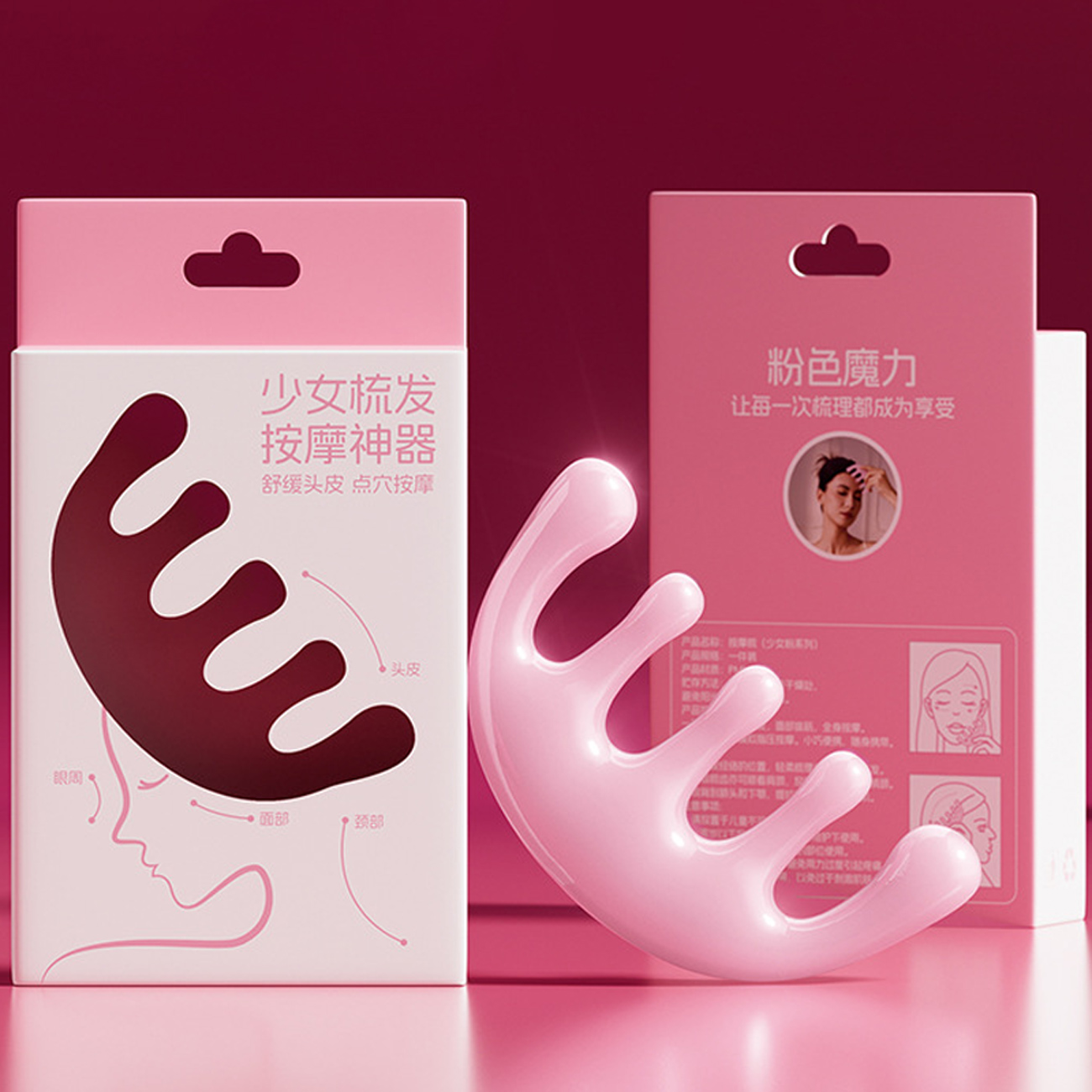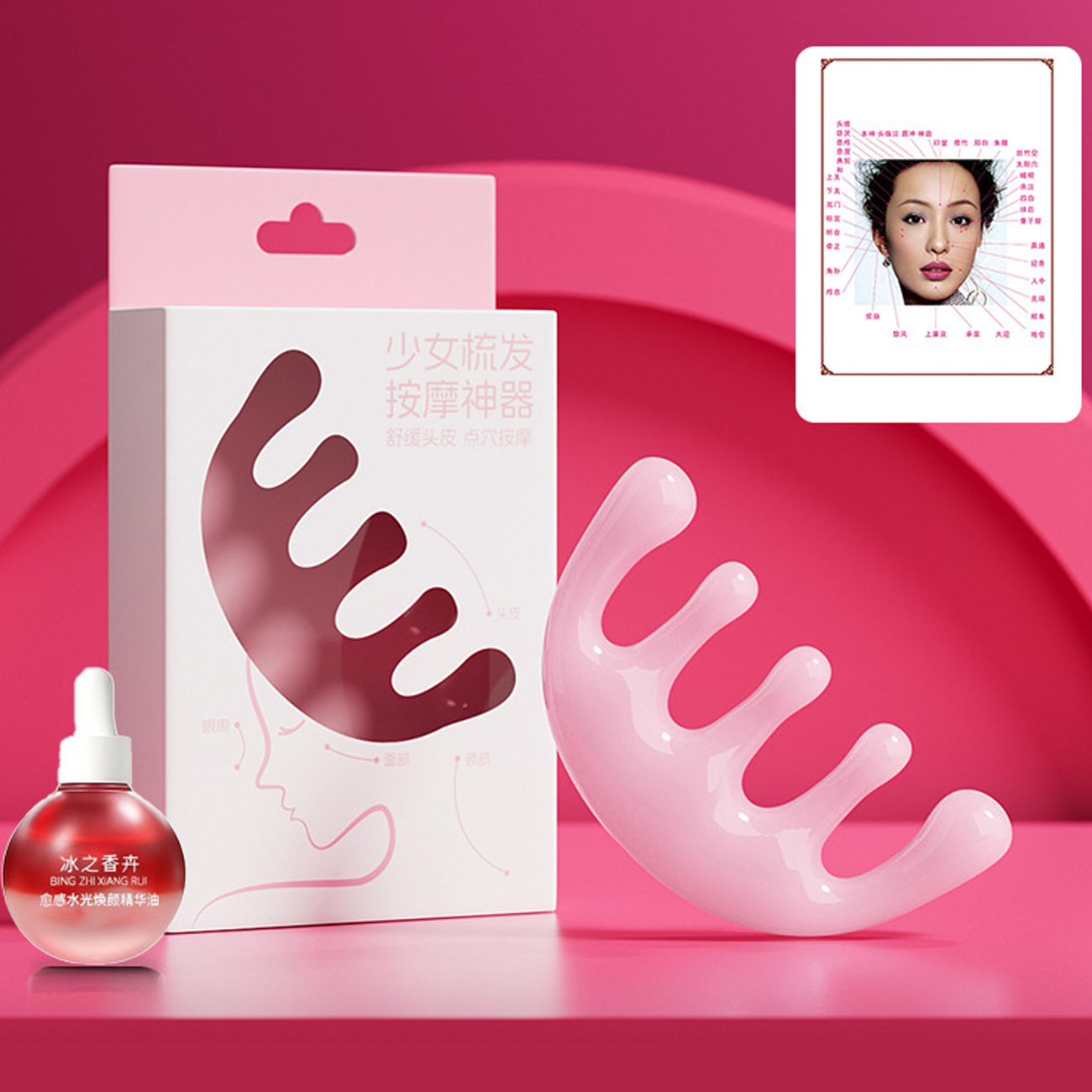 Pink girl's massage comb for facial lifting and scalp massage