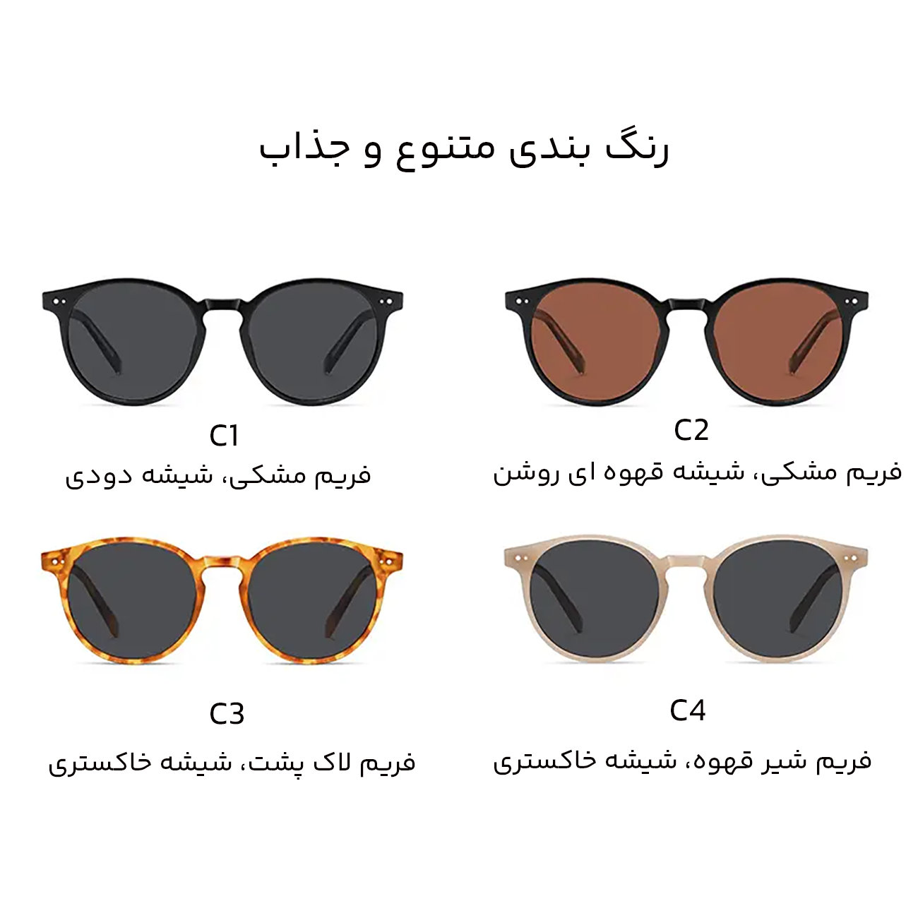 | رنگ بندی متنوع و جذاب | فریم مشکی، دسته پلنگی، شیشه قهوه ای روشن c2/ فریم لاک پشت، شیشه خاکستری C3/ فریم مشکی، شیشه دودی C1 / فریم شیر قهوه، شیشه خاکستری C4 |
