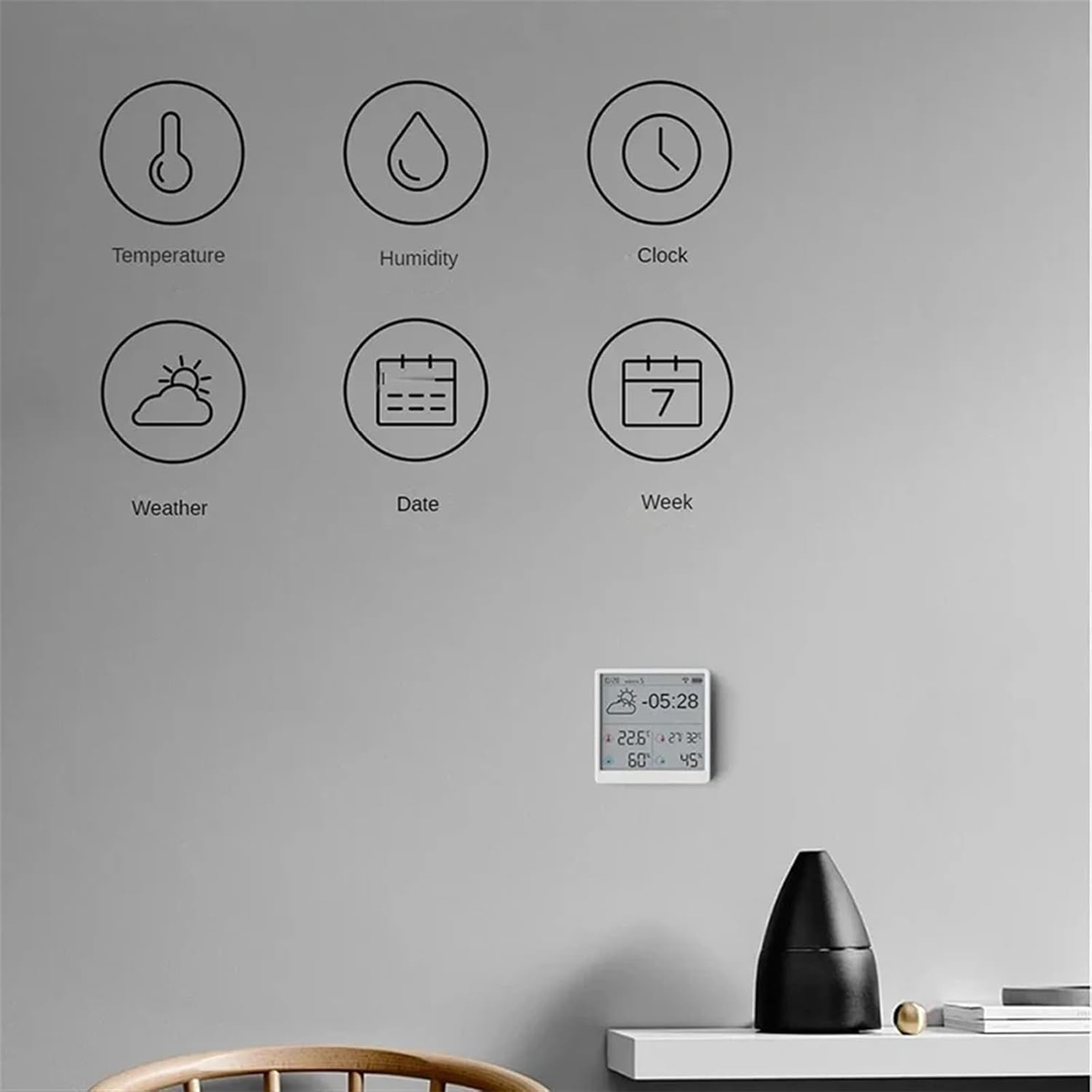 | زمان کالیبراسیون خودکار بدون نیاز به تنظیمات دستی | همگام سازی خودکارساعت، تاریخ، هفته و .. پس از اتصال دماسنج و رطوبت سنج به اینترنت |
