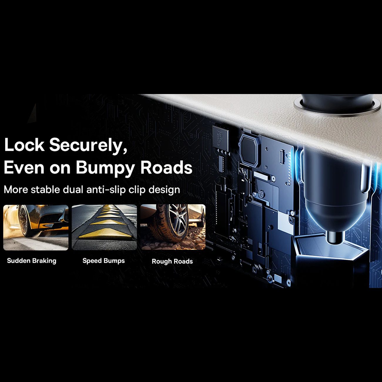 | ثبات در خودرو | دارای دو گیره ضدلغزش برای حفظ شارژر در جای خود حتی روی دستاندازها و سرعتگیرها |