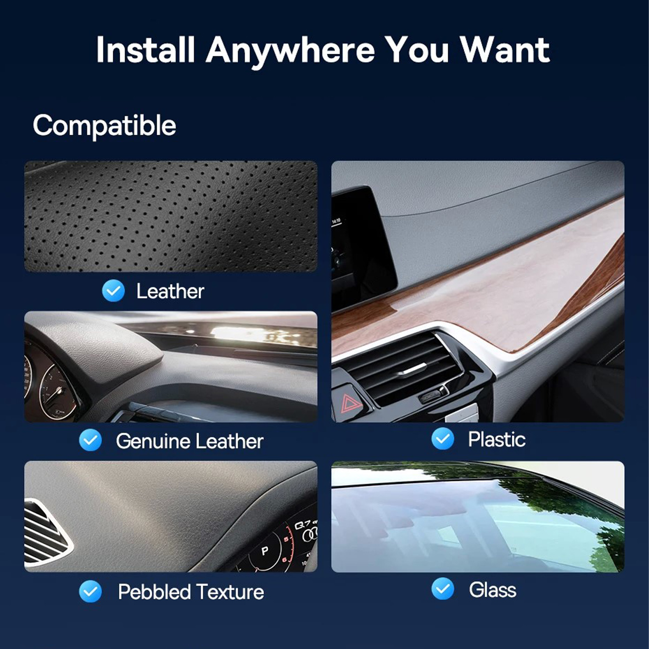| محل نصب | داشبورد، شیشه جلو، سطوح صاف |