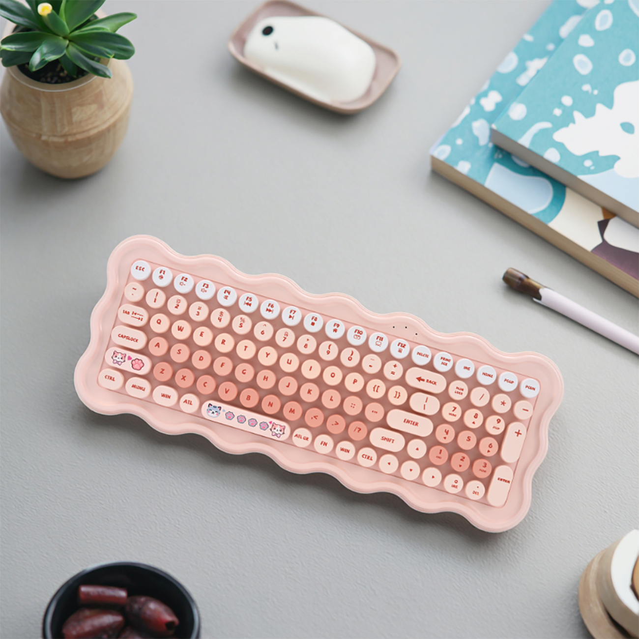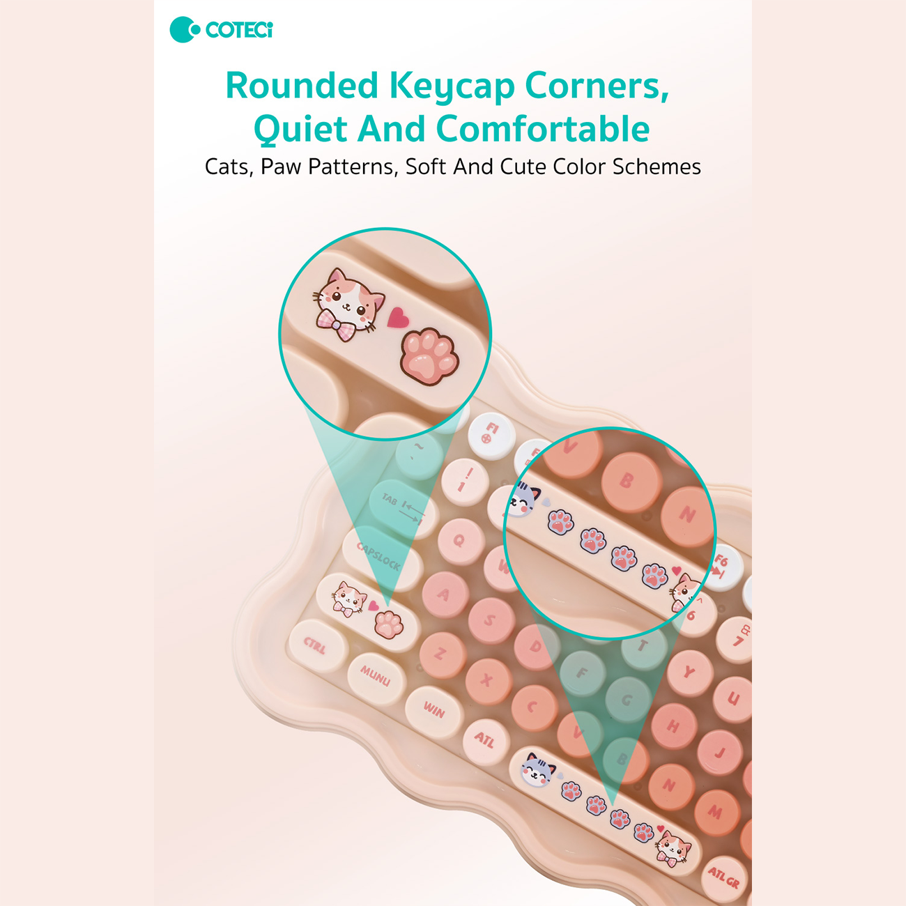 | ویژگیهای شاخص کلیدهای کیبورد | گوشه های گرد کلیدها، بدون صدا و راحت/ طراحی گربه و پنجه گربه/ طرح های رنگی ملایم و زیبا |